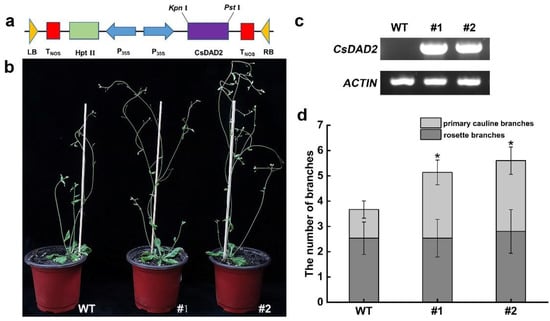 Identification and phenotypic analysis of CsDAD2-overexpressed Arabidopsis. (a) Schematic representation of a construct used for Agrobacterium tumefaciens-mediated transformation with the CsDAD2 gene; (b) branching phenotypes of wild-type and representative individuals of two independent 35s::CsDAD2 lines; (c) expression levels of CsDAD2 in WT and two 35s::CsDAD2 lines as determined by PCR; (d) counts of the number of rosette branches and primary cauline branches, with 15 plants used per genotype to analyze the plants’ phenotypes (Student’s t test: * p < 0.05).