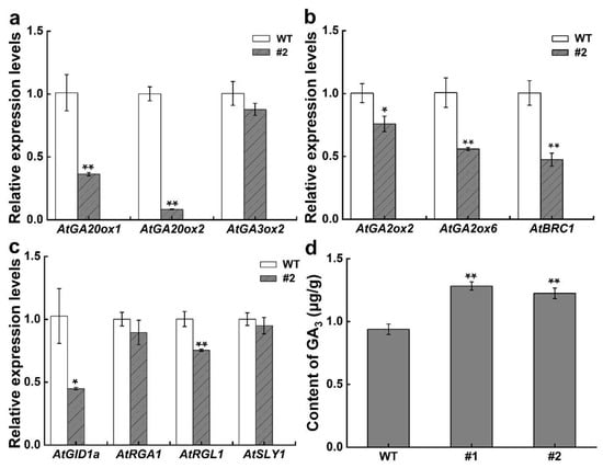 The number of primary cauline branches in the two transgenic lines increased significantly compared with WT; the increase in line #1 and #2 was 2.6- and 2.8-fold higher than in WT (Figure 3b,d). Line #2 was selected for subsequent experiments.