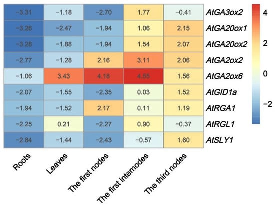Expression of GA-related genes after CsDAD2 overexpression in different tissues of Arabidopsis. The numbers represent the log2fold-change of gene expression values between #2 and WT. Positive and negative numbers respectively represent up-regulated and down-regulated gene expression in #2 relative to WT.