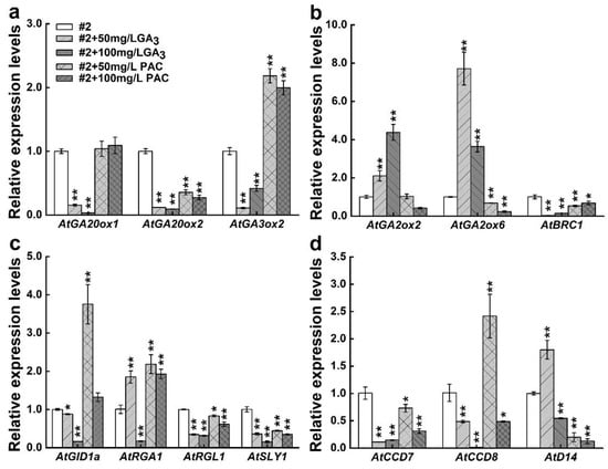 Expression of GA-related genes and SL-related ones in CsDAD2-overexpressed Arabidopsis treated with GA3 and PAC. The expression of GA-related and SL-related genes was detected by qRT-PCR in CsDAD2-overexpressed Arabidopsis at the eight-leaf stage after three hours of GA3 and PAC treatment (0, 50, 100 mg/L GA3 and 50, 100 mg/L PAC). (a) GA biosynthesis genes; (b) GA degradation genes; and bud dormancy gene AtBRC1; (c) GA signaling genes; (d) SL related genes. Data represent the mean ± SD of three biological replicates (Student’s t test: * p < 0.05, ** p < 0.01).