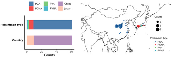 The persimmon (Diospyros kaki Thunb.: Ebenaceae) is an important subtropical fruit in East Asia, where it is appreciated for its high quality and abundance of beneficial bioactive compounds (phenolics, pectin, soluble sugars, main minerals, etc.) [1]. According to pomology, there are four different types of persimmon cultivars: pollination−constant and non−astringent (PCNA), which is non−astringent whether or not there are seeds; pollination−constant and astringent (PCA), which is astringent whether or not there are seeds; pollination−variant and non−astringent (PVNA), which is astringent if there are few or no seeds; pollination−variant and astringent (PVA), which has non−astringent flesh around the seeds only [2,3,4]. Generally, we call PCNA and PVNA non−astringent persimmons because they are non−astringent and sweet at harvest maturity with firm flesh, and we call PCA and PVA astringent persimmons because they lose astringency when they become over−ripe with extremely soft flesh [4,5]. Persimmons are believed to have originated in China as a significant food source in prehistoric times, and an extensive history of cultivation has resulted in the development of roughly 1000 different varieties of D. kaki from subtropical regions to temperate regions, except Tibet, Sinkiang, Inner Mongolia, Qinghai, Heilongjiang, and Jilin [5,6,7]. However, besides a few PCNA germplasms found in Luotian County, Hubei Province, the rest are all PCA−type in China, and most PCNA and PVA varieties were introduced from Japan [7,8,9].
