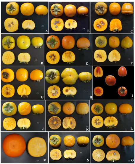 - Maeda, H.; Akagi, T.; Tao, R. Quantitative characterization of fruit shape and its differentiation pattern in diverse persimmon (Diospyros kaki) cultivars. Sci. Hortic. 2018, 228, 41–48. [Google Scholar] [CrossRef]