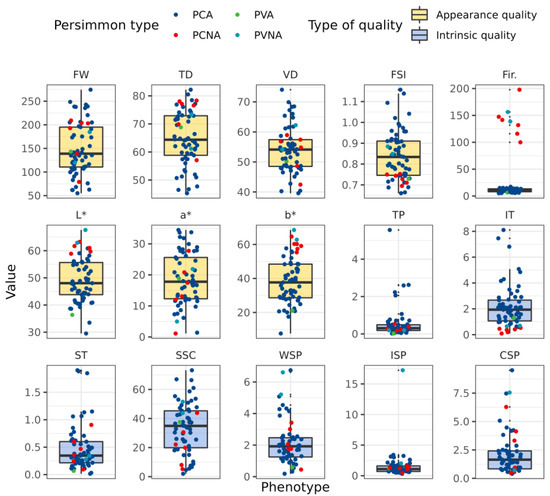 Color, shape, and size are examples of appearance qualities that can visually represent the external morphological characteristics of each species. These qualities are important indices for evaluating the quality of commodities and the characteristics of varieties, and they serve as basis for satisfying consumers’ demands for “good look,” which impacts their purchasing decisions [28]. China has a long history of persimmon cultivation and is one of the persimmon’s native regions. Numerous phenotypic variations have resulted from long−term natural evolution and human selection. In this study, it was determined that the diversity in persimmon fruit appearance quality was significant and widely distributed and that the majority of germplasm resources were in the medium level of fresh fruit weight, transverse diameter, and vertical diameter with normal distributions. Maede et al. [29] found that there was considerable shape diversity among different persimmon cultivars. Zhang et al. [30] compared the morphological diversity of 260 persimmon cultivars, found the CV values of longitudinal diameter, transverse diameter, lateral diameter, fruit shape index, stalk length, stalk diameter, pedicle length, pedicle width, and fresh weight per fruit ranged from 16.98% (fruit shape index) to 50.57% (fresh weight per fruit). The results of this study were consistent with these findings. The firmness, L*, and b* values of PCNA and PVNA persimmon fruit were greater than those of PCA and PVA, whereas the variation range of PCA and PVA persimmon fruit was greater than PCNA and PVNA. This is because PCA and PVA persimmon fruit lose astringency until they soften and turn red with over−ripening, whereas PCNA and PVNA persimmon fruit lose astringency when the fruit turns orange.