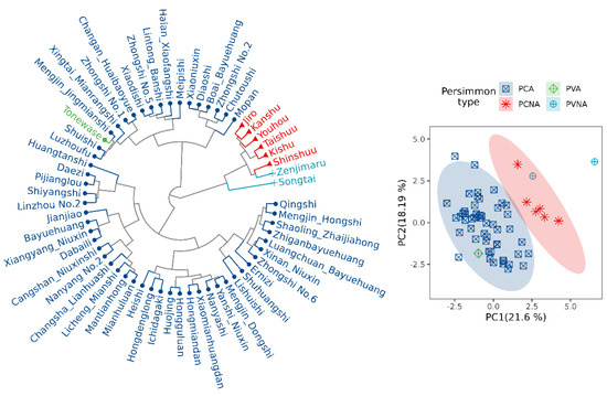 Cluster analysis and principal component analysis of 61 different persimmon cultivars.