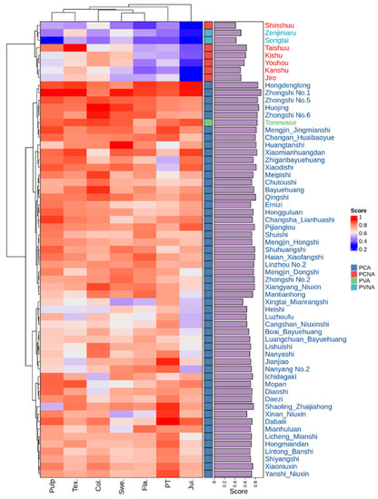 The synthetic “Reasonable−satisfaction” scores and cluster analysis of sensory quality evaluation with different cultivars of persimmon fruit. Note: Pulp: Pulp; Tex.: Texture; Col.: Color; Swe.: Sweet; Fla.: Flavor; PT: Pericarp thickness; Jui.: Juice.