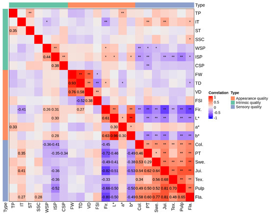 Pearson correlation of appearance, intrinsic and sensory qualities. Note: TP: Total polyphenols; IT: Insoluble tannin; ST: Soluble tannin; SSC: Soluble sugar content; WSP: Water soluble pectin; ISP: Ironic soluble pectin; CSP: Covalent soluble pectin; FW: Fresh weight; TD: Transverse diameter; VD: Vertical diameter; FSI: Fruit shape index; Fri.: Firmness; Col.: Color; PT: Pericarp thickness; Swe.: Sweet; Jui.: Juice; Tex.: Texture; Pulp: Pulp; Fla.: Flavor. * and ** indicate significant difference at the level of 0.05 and 0.01, respectively.