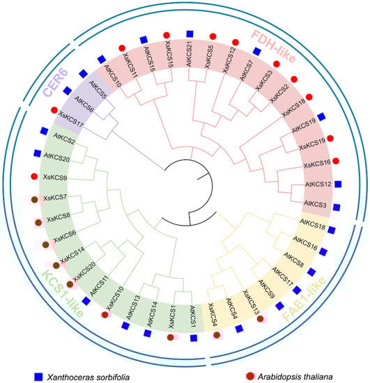 The plant epidermal wax is a barrier between the plant and the environment and plays a key role in plant response to various biotic and abiotic stresses, such as drought and salinity [26]. VLCFA is an important precursor substance for the synthesis of plant cuticle waxes. KCS family genes, which encode the key restriction enzyme in the VLCFA synthesis pathway, have been identified in various plant species [4,27,28]. In this study, 20 XsKCS genes were identified in the yellow horn genome (Table 1). According to the AtKCS genes, all KCS proteins in yellow horn were classified into four groups: KCS1-like, FDH-like, FAE1-like, and CER6, similar to the previous classification of Arabidopsis (Figure 1) [8]. Unlike Arabidopsis, the FAE1-like group has only two members in the yellow horn (Figure 1).