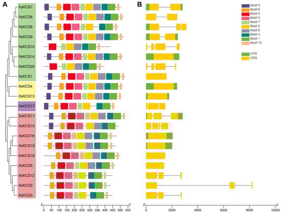 In order to explore the structural features of the XsKCSs, the MEME tool (https://meme-suite.org/meme/doc/meme.html, accessed on 20 March 2022) was used to identify 10 conserved motifs in XsKCS family members. The TBtools (v1.098696) was used to display the gene structures and motifs [22].