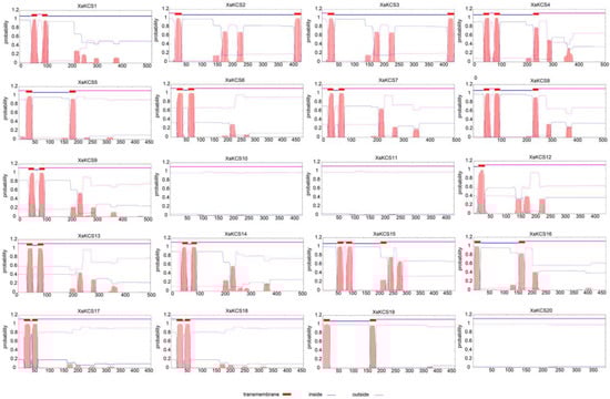 According to previous reports, the KCS gene family is a class of transmembrane proteins [25]. In order to further explore the transmembrane structure of XsKCS proteins, the TMHMM (v2.0) tool was used to predict the transmembrane alpha helix of XsKCS proteins (Figure 3). The results showed that most XsKCS proteins (13 proteins, 65%) had two transmembrane alpha helices; XsKCS4, XsKCS8, XsKCS11, and XsKCS15 had three transmembrane alpha helices; XsKCS12 had one transmembrane alpha helix. Surprisingly, XsKCS10 and XsKCS20 had no transmembrane alpha helix. Most of the transmembrane alpha-helices of XsKCS proteins are located in the N-terminal pre-100 bp, and only a few transmembrane alpha helices are located in the C-terminal pre-100 bp or sequence middle.