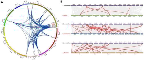 Chromosomal distributions, synteny analysis within the yellow horn and between yellow horn and three representative plant species. (A) The chromosome distribution and chromosome relationship of the yellow horn XsKCS genes. The blue lines indicate the repeated pairs of XsKCS genes, and the red letters represent tandem repeats. (B) Synteny analysis between yellow horn (X. sorbifolium) and three representative plant species, O. sativa, P. trichocarpa and A. thaliana. The grey lines are indicative to the collinear blocks within yellow horn and other plants; the red lines refer to the syntenic XsKCS gene pairs.
