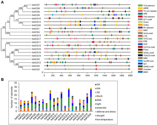To explore the cis-regulatory elements in the promoter of the XsKCS gene, a 2000 bp nucleic acid sequence on the XsKCS gene start codon was downloaded and analyzed by submitting it to the PlantCARE server (Figure 5). Not surprisingly, we found many cis-acting elements in the promoter of the XsKCS gene that are involved in the corresponding plant hormone and stress responses. These elements belong to nine main categories: ABA, JA, SA, GA, IAA, light, low temperature, defense and stress, drought, and anaerobic. Among 20 XsKCS genes, XsKCS4, XsKCS9, XsKCS12, XsKCS14, XsKCS19, and XsKCS20 have more hormone and stress-related elements. Notably, there were more ABA response elements and light response elements than other response elements (Figure 5B).