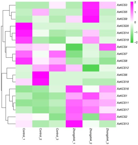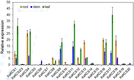 In order to investigate the biological functions of XsKCS genes in stress response, their expression levels were examined in the roots, stems, and leaves by qRT-PCR. As shown in Figure 6, XsKCS1, XsKCS4, XsKCS9, XsKCS11, XsKCS12, XsKCS13, XsKCS16, XsKCS17, and XsKCS18 exhibited higher expression levels in the roots, stems or leaves, especially in the leaves, while XsKCS18 was lowly expressed in the leaves. Conversely, XsKCS2/3, XsKCS7, XsKCS14, XsKCS15, XsKCS19, and XsKCS20 had lower expression levels, and XsKCS5 was not even detected in the roots, stems, and leaves. XsKCS6 was expressed at a relatively high level in the stem and XsKCS10 in the root. The tissue-based expression profiling of XsKCS genes suggested that XsKCSs show gene functional divergence in response to stress, except XsKCS5.