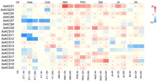 The expression heat map of XsKCS genes under different stress treatments. Scale bar on the right represents the relative expression level of each gene detecting by qRT-PCR. * indicates significant differences at p < 0.05. The significance analysis was performed by SPSS 25 with one-way ANOVA and Duncan multiple comparison analysis.