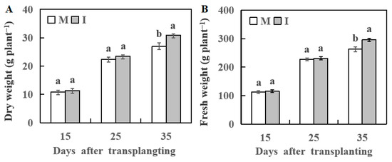 Dry weight of watermelon (A) and fresh weight of watermelon (B) at 15, 25, and 35 days after transplanting, respectively. M, watermelon plants grown in monoculture system; I, watermelon with wheat grown in the intercropping system. All values are mean ± SE (n = 3). The different letters on the columns of the same day indicate statistically significant differences between treatments (p < 0.05, t-test).