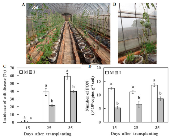Changes in wilt disease of watermelon at 15, 25, and 35 days after transplanting, respectively. (A) Changes in phenotypes of watermelon at 35 day after transplanting. (B) The symptoms of Fusarium wilt in watermelon. (C) The incidence rate of wilt disease in watermelon. (D) The number of FON in the rhizosphere of watermelon. M, Watermelon plants grown in monoculture system; I, Watermelon with wheat grown in an intercropping system. All values are mean ± SE (n = 3). The different letters on the columns of the same day indicate statistically significant differences between treatments (p < 0.05, t-test).