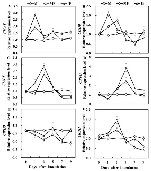Relative expression levels of ClCAT (A), ClSOD (B), ClAPX (C), ClPPO (D), ClPOD (E), and ClCHI (F) defensive enzyme genes in watermelon roots in response to FON infection. M, Watermelon plants grown in a monoculture system; MF, Watermelon plants grown in a monoculture system with FON inoculation; IF, Watermelon with wheat grown in the intercropping system with FON inoculation. All values are mean ± SE (n = 3).