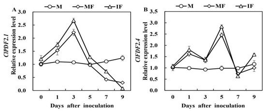 Relative expression levels of CIPDF2.1 (A) and CIPDF2.4 (B) defensin-like genes in watermelon roots in response to FON infection. M, Watermelon plants grown in a monoculture system; MF, Watermelon plants grown in a monoculture system with FON inoculation; IF, Watermelon with wheat grown in the intercropping system with FON inoculation. All values are mean ± SE (n = 3).