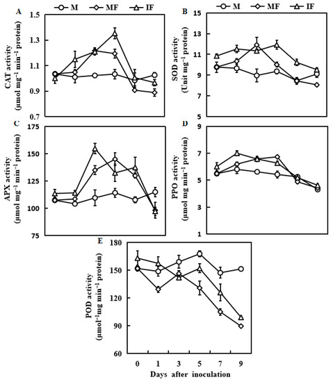 Responses of CAT activity (A), SOD activity (B), APX activity (C), PPO activity (D), and POD activity (E) in watermelon roots in response to FON infection. M, Watermelon plants grown in a monoculture system; MF, Watermelon plants grown in a monoculture system with FON inoculation; IF, Watermelon with wheat grown in the intercropping system with FON inoculation. All values are mean ± SE (n = 3).