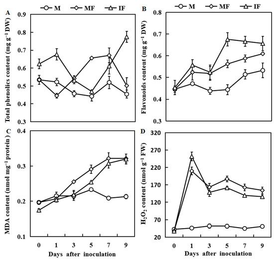 Responses of total phenolics content (A), Flavonoids content (B), MDA content (C), and H2O2 content (D), in watermelon roots in response to FON infection. M, Watermelon plants grown in a monoculture system; MF, watermelon plants grown in a monoculture system with FON inoculation; IF, Watermelon with wheat grown in the intercropping system with FON inoculation. All values are mean ± SE (n = 3).