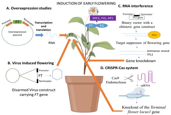 The juvenility is the incompetency towards flower production and ultimately fruit production. The induction of early flowers is essential for accelerating the fruit crop improvement programme that will result in the reduction of the long juvenility phase followed by efficient fruit production. The early flowering induction in the perennial crops is required to overcome the state of innate long juvenile phase as it is the major impediment to transferring the desirable traits into the elite cultivars, hence, de-accelerating the perennial plant breeding programmes [10]. The long generation time is the hindrance in the dissection using molecular approaches in the perennial crops [3]. The perennial crops tend to exhibit a slow breeding cycle, longer reproductive cycle and high degree of heterozygosity posing difficulties in plant breeding programmes [11,12]. Besides being a slow and arduous process, it is an expensive process due to the requirement of 10 to 20 years for the release of a new cultivar in perennial tree species [11]. The generation of early flowering is a promising strategy to escape the drought conditions for the production of advanced drought-adapted wheat cultivars [13]. The detailed knowledge to understand the early flowering system can reveal the genetics of traits along with the transfer of traits of interest into commercially acceptable germplasm [11]. The use of early flowering plants proved to be beneficial for gene introgression, quantitative trait loci and pyramiding of several genes of interest in a specific pre-breeding line in a limited period of time [14]. In this way, induced early flowering results in the quick screening of species, saving greenhouse space and labor that will boost the selection of new varieties leading to the development of efficient breeding programmes at a lower cost [15]. This review aims to provide detailed information about the prevalence of long juvenile phases among perennial crops. It also enlists the various flowering genes in the perennial plants and implementation of biotechnological approaches including overexpression studies, virus-induced flowering, RNA interference and CRISPR-Cas (Figure 1) for the induction of early flowering in perennials. In the previous era, flowering genes were identified by Almeida et al. [16] using analysis of mutant combinations and chromosomal duplication studies.