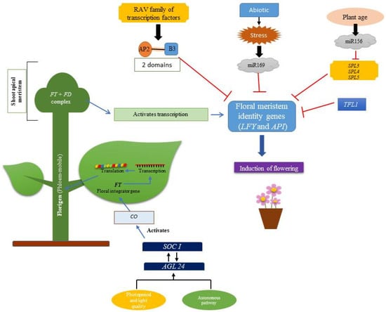 Various genes involved in regulation of flowering in plants [RAV, Related transcription factors to AP1 and VP1; stress and age induced microRNAs formed (miRNA169 and miRNA156, respectively) are involved in transcription repression of floral meristem identity genes; i.e., LFY and AP1 genes whereas Agamous like 24 (MADS box transcription factor) interacts with SOC1 (Suppressor of overexpression of CONSTANS) and activates CO1 (CONSTANS1) gene resulting in activation of Floral integrator gene, FT, which interacts with bZIP transcription factor, FD, hence, expressing floral meristem identity genes resulting in flowering].