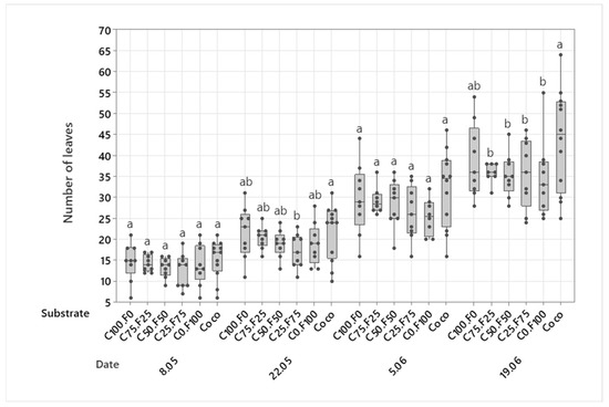 Accumulation of the number of leaves per plant every two weeks during plant establishment of the strawberry cv. ‘Murano’ grown in different substrate mixtures in Experiment 1. The treatments are C100.F0 (100% compost, 0% wood fiber), C75.F25 (75% compost, 25% wood fiber), C50.F50 (50% compost, 50% wood fiber), C25.F75 (25% compost, 75% wood fiber), C0.F100 (0% compost, 100% wood fiber) and Coco (100% coconut coir). Leaves were counted on each plant in each container (n = 9). Means within the same period that do not share a letter are significantly different based on the Fisher LSD Method (95% CI).