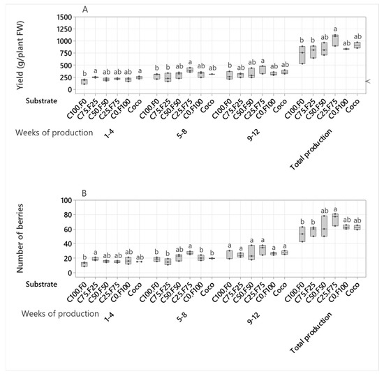 Distribution of (A) yield (g/plant FW) and (B) number of berries in early (week 1–4), mid (week 5–8) and late (week 9–12) production in experiment 1, where strawberries cv. ‘Murano’ were cultivated in different substrate mixtures: C100.F0 (100% compost, 0% wood fiber), C75.F25 (75% compost, 25% wood fiber), C50.F50 (50% compost, 50% wood fiber), C25.F75 (25% compost, 75% wood fiber), C0.F100 (0% compost, 100% wood fiber) and Coco (100% coconut coir). For all treatments except Coco, n = 3, where n is the average of three plants from the same container. For Coco, due to one container being an outlier, n = 2. Means within the same period that do not share a letter are significantly different based on the Fisher LSD Method (95% CI).