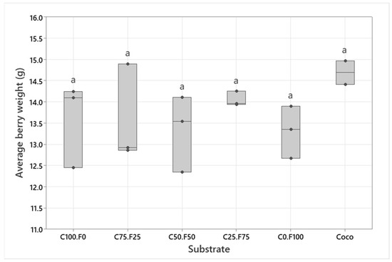 As for quality parameters in the fruits, the lower firmness in treatments C25.F75 and coconut coir (Figure 4) was likely due to a larger size of the berries grown in these treatments, although the differences in size were not statistically significant (Figure 3). The lack of differences in chemical quality parameters in the form of sugar content, pH, acidity, color, antioxidants, phenols, anthocyanins or vitamin C is consistent with previous literature that showed that growing media alone can have varying but often little impact on these parameters [8,36,37,38].