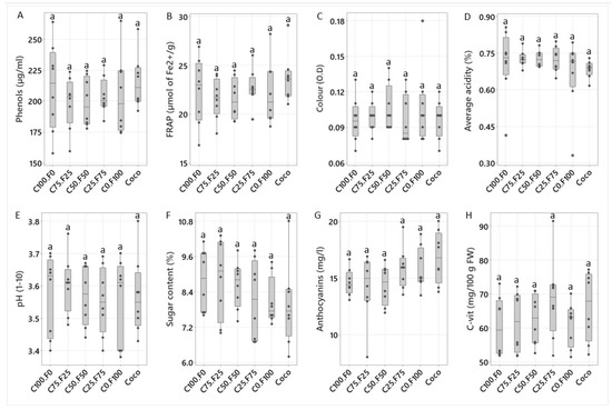 Chemical quality parameters phenols (μg/mL) (A), FRAP (μmol of Fe2+/g) (B), color (Optical density 1–10) (C), average acidity (%) (D), pH (1–10) (E), sugar content (%) (F), anthocyanins (mg/L) (G) and vitamin C (mg/100 g FW) (H) for strawberries in experiment 1, where cv. ‘Murano’ was cultivated in different substrate mixtures: C100.F0 (100% compost, 0% wood fiber), C75.F25 (75% compost, 25% wood fiber), C50.F50 (50% compost, 50% wood fiber), C25.F75 (25% compost, 75% wood fiber), C0.F100 (0% compost, 100% wood fiber) and Coco (100% coconut coir). For all treatments, n = 8, where n = juice sample from 70 g of berries from the same treatment. Individual standard deviations were used to calculate the intervals. Means that do not share a letter are significantly different based on the Fisher LSD Method (95% CI).