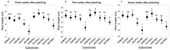 Monitoring of the plant growth during the establishment phase revealed remarkable differences in plant height between the substrates (Figure 6). At the beginning of plant growth monitoring (on 6 June 2020, three weeks after planting, Figure 6A), substrates with added start fertilizer generally promoted early vegetative growth of strawberry plants However, after the two following weeks (Figure 6B), the differences were less pronounced and only significant for the pairs P75.F25, P50.F50 and P0.F100. After an additional two weeks, the differences were negligible (Figure 6C), although still visible for 100% wood fiber. In addition, the general trend revealed that the use of substrates with high percentage of wood fiber (more than 50%) might adversely affect strawberry plant growth. However, there is also a premise that fertilizer applied prior to planting can mitigate this response, especially in the initial phase of plant establishment (Figure 6A–C).