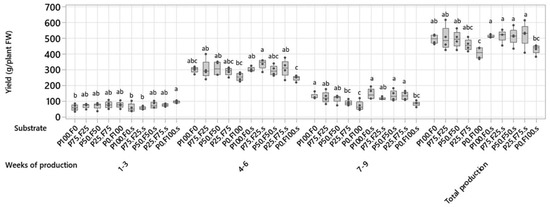 The yield in weight and number of berries is presented in Figure 2, where the harvest period is divided into three intervals (early: 1–4 weeks of production, middle: 5–8 weeks and late: 9–12 weeks). In addition, total berry production is also summarized in the last panel. After the early weeks of production, when C75.F25 and coconut coir performed the best, the treatment C25.F75 remained the best performing treatment throughout the middle and late harvest periods. The latter treatment produced the highest yield and total number of berries.