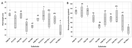 (A) Plant height (cm) and (B) biomass (g/plant) production. Plant height (cm) and biomass (g/plant) production for strawberry cv. Malling Centenary (n = 4, the largest plant from each replication) registered during termination of Experiment 2. Means within the same period that do not share a letter are significantly different based on the Fisher LSD Method (95% CI).