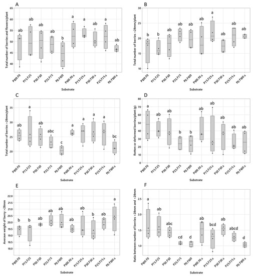 Total number of flowers and berries produced in strawberry plants of cv. Malling Centenary (n = 4) grown in different substrate mixtures: (A) total number of berries and flowers/plant, (B) total number of berries <28 mm, (C) total number of berries >28 mm, (D) number of rotten or deformed berries, (E) average weight of berries >28 mm, (F) ratio between marketable (>28 mm) and small berries. Means within the same period that do not share a letter are significantly different based on the Fisher LSD Method (95% CI).