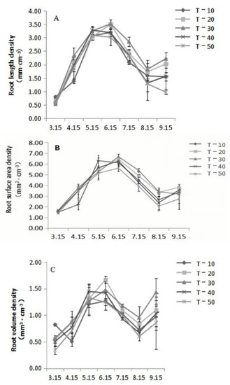 As shown in Figure 1B, the root surface density of each treatment generally was bimodal with an increasing–decreasing–increasing pattern. The root surface density increased from mid-March to mid-June, and the root growth peak occurred in June. At thatmoment, the root surface area density of T-30 (6.68 mm2·cm−3) was significantly higher than that of T-10 and T-50. The root growth of each treatment continually decreased from mid-June to mid-August. The root growth rate was the lowest in August. At that moment, the root surface area density of the T-50 treatment (2.06 mm2·cm−3) was significantly higher than that of T-20 and T-30, and the growth rate of the roots increased from mid-August to mid-September.