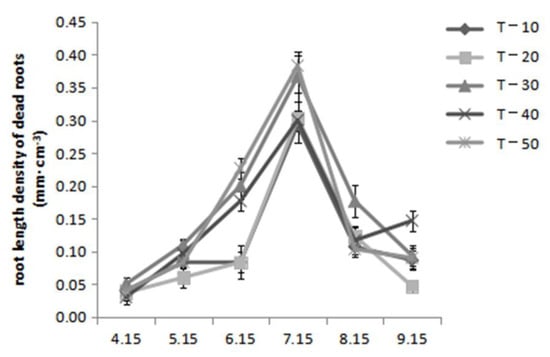 As shown in Figure 2, the root length density of dead roots in each treatment generally showed a single-peak curve with an increasing then decreasing trend. From mid-April to mid-July, the root length density of dead roots increased, and the death peak of roots occurred in July. At that time, the root length density of the dead roots (0.38 mm·cm−3) of T-50 was significantly higher than that of T-10, T-20, and T-40. The root length density of the dead roots showed a downward trend from mid-July to mid-September, indicating that the rate of root death of each treatment decreased continuously from mid-July to mid-September.