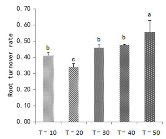 Figure 3 shows the significant differences in root turnover rate between treatments. The root turnover rate increased with interstock length. The T-50 root turnover rate was the highest (0.56), which was significantly higher than other treatments, followed by T-40 (0.47), and T-20 (0.34).