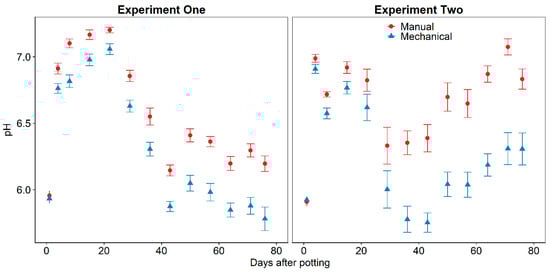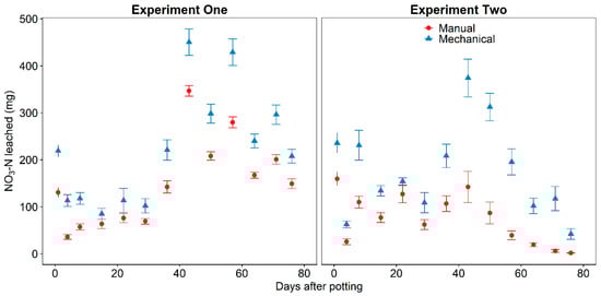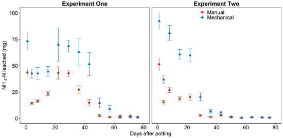Leaching volume data from day one for each experiment was analyzed separately from other days to meet model assumptions of Gaussian distribution, homoscedasticity, and linearity. Daily and total experiment leaching volume, daily pH, and total NH4-N, NO3-N, and soluble salts in leachate were analyzed with Student’s T-test to compare mechanically and manually incorporated CRF. Container number was given a random intercept to account for possible dependence among leaching volume over the sampling days. Daily pH data from experiment one had a single outlier on day 29 from the manually incorporated CRF and Shapiro–Wilks test indicated that residuals were not normally distributed (W = 0.77). The outlier was removed from the dataset and Shapiro–Wilks test indicated Gaussian distribution of residuals (W = 0.996). The data without the outlier was used in calculating summary statistics for the leachate pH from substrate with mechanically incorporated CRF and to determine significant difference from manually incorporated CRF. The planted substrates for both manually and mechanically incorporated CRF each had one replicate plant that was visibly smaller. A normal probability plot of plant shoot dry biomass identified these plants as outliers and a Shapiro–Wilk test indicated that the assumption of Gaussian distribution of residuals was not met (W = 0.83). A Student’s T-test was performed on the shoot dry biomass with and without the outliers included in the data. Although, removing the outliers improved the normality of the residual errors (W = 0.96) and reported p-value was different with or without the outliers included, both p-values were greater than significance level (α = 0.05). Therefore, the reported plant shoot dry biomass includes the two abnormally small plants.