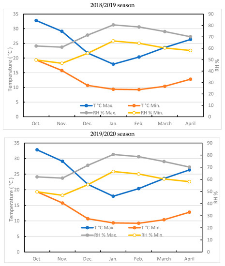 Average maximum and minimum temperature and relative humidity per month during the study in both seasons.