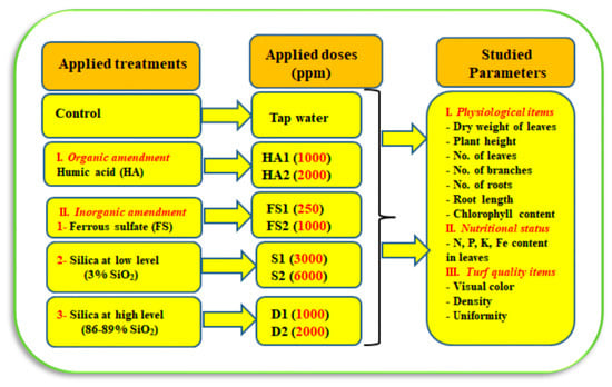 The plant materials were obtained from the Horticulture Department at Kafrelsheikh University. A field study was run from October to April over two separate cold seasons. Some of the amendments that were investigated in the current study included humic acid (organic) and sources of iron and silicon (inorganic). Both types of grasses were treated with humic acid, ferrous sulphate (FeSO4), and two silica (S) sources (low level or Citrok Plus silica as 3% SiO2 and high level or diatomite silica as 86–89% SiO2) in two doses (Table 1 and Figure 2). Each experimental plot consisted of one grass unit with an area of 10 m2. Each unit received five sprays every two weeks starting from 9 October until 9 December. After 9 December, the units were sprayed until the point of run-off at 20 days intervals. Treatments in both seasons were arranged according to a randomized complete block design (RCBD) with three replicates.