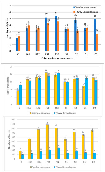 Mean values of leaf dry weight (g), root length, and number of leaves measured in January for the two species treated with different amendments obtained from combining the data from two seasons. C = control, HA = humic acid, FS = ferrous sulphate, S = silica, D = diatomite. For more details about the treatments used, please refer to Table 1. Values are presented as mean ± standard error of the mean, with the letter(s) from the species-wise Duncan’s multiple range tests indicated at the top of each bar. The area used for measuring the parameters was 100 cm2.