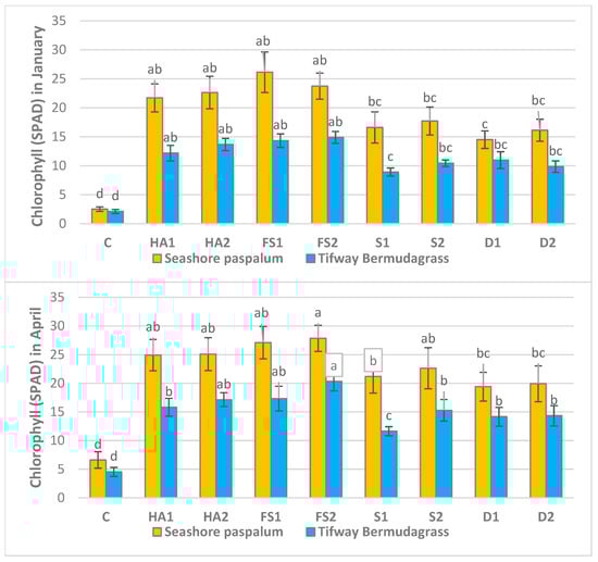 Mean values of chlorophyll content in leaves in both January and April (SPAD value ± SE) for seashore paspalum and Tifway bermudagrass treated with different amendments; values represent a mean of the two seasons. C = control, HA = humic acid, FS = ferrous sulphate, S = silica, D = diatomite. For more details about the treatments, please refer to Table 1. Data are presented as mean ± standard error of the mean, with the letter(s) from the species-wise Duncan’s multiple range tests indicated at the top of each bar.