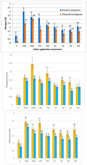 Mean leaf content of nitrogen (%), phosphorus (%), potassium (%) and iron (mg kg−1) ± SE in seashore paspalum (orange bars) and Tifway bermudagrass (blue bars) treated with different amendments; values represent a mean of the two seasons. C = control, HA = humic acid, FS = ferrous sulphate, S = silica, D = diatomite. For more details about the treatments, please refer to Table 1. Data are presented as mean value ± standard error of the mean, with the letter(s) from the species-wise Duncan’s multiple range tests indicated above each bar.