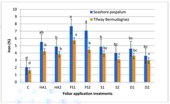 Thus far, only a few studies have attempted to explain the production of warm-season turfgrasses under combined stresses. In one study, Liu et al confirmed that exposing turfgrasses to combined cold and salinity stress may cause more severe damage compared to growing turfgrasses under other conditions [42]. The results obtained in this study are in agreement with those of Chavarria et al. [49], who confirmed that turfgrass species and their cultivars differ in their tolerance to salinity stress. Concerning the role of humic acid under conditions of combined stress, its positive effects may be related to the enhancement of various antioxidants and subsequent scavenging of superoxide anions in the leaves, which protects the plant cell from damage caused by reactive oxygen and free radicals that are formed under stress. Our results are in agreement with the results of Abdel Fatah et al. [50], who concluded that the application of humic acid increased the content of nitrogen, phosphorus, and potassium in the leaves of bermudagrass. In the current study, it seems that treatment with iron sources not only increased the iron content in the leaves, but also increased the content of other nutrients. The stimulatory effects of humic acid on the nitrogen, phosphorus, and potassium contents of leaves have been observed in other studies. In addition to enhancing the bioavailability of phosphorus, humic acid has also been shown to increase both the availability of micronutrients and the phosphorus content of leaves [54,55] and improve nutrient uptake by plants.