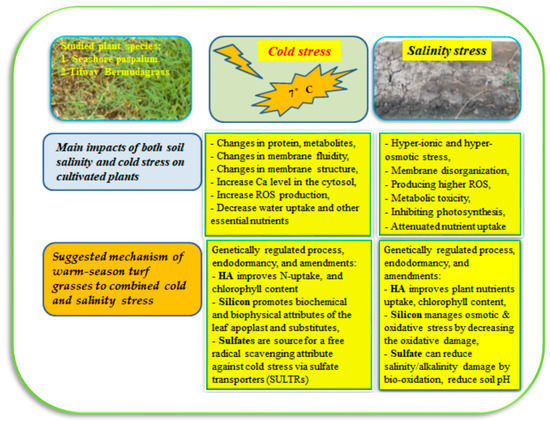 Abiotic stresses (e.g., drought, salinity, and cold stress) inhibit a plant’s water uptake by creating osmotic imbalance or osmotic stress at the root–soil interface, and are considered to be the main factors that limit the growth and development of turfgrasses [10]. There are few studies published about the effect of combined abiotic stresses on turfgrasses (e.g., Torun et al. [11]), whereas the effect of individual stresses such as salinity stress is more widely investigated [10,12]. Cold temperature is a major abiotic stress affecting warm-season turfgrasses that ultimately leads to reduced growth and quality due to wilting and leaf firing [13]. Cold stress may also induce dormancy and affects CO2 absorption during photosynthesis, thus promoting a decline in the photosynthetic production [14]. Warm-season grasses grow most actively within the temperature range 25–35 °C [1], whereas the optimal range for growth of cool-season grasses is 16–24 °C [15]. Turfgrasses of tropical and subtropical origin are susceptible to injuries at temperatures below 12 °C [16]. Plant nutrients (i.e., exogenous and indigenous) have beneficial effects on grass metabolism, including stimulating vital processes that result in greater turfgrass tolerance to abiotic and biotic stresses such as applied calcium [13] or foliar application of amino acids [17]. Thus, the application of amendments could benefit warm-season grasses during the winter in arid/semi-arid regions.