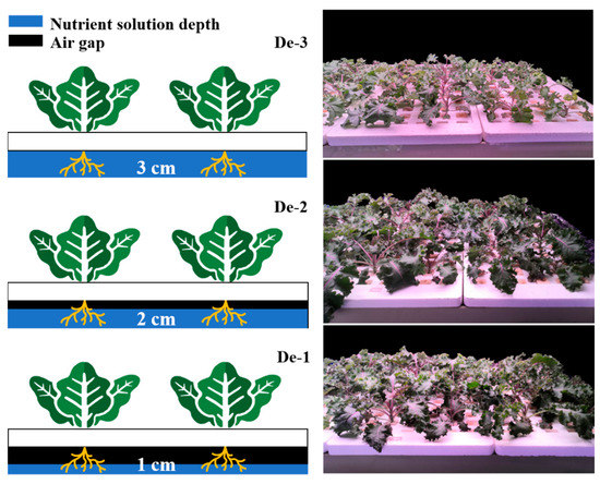 Various attempts have been conducted to ensure enough dissolved oxygen content in the nutrient solution and prevent root rot. Aeration is one of the useful methods that generates bubbles by air pump or air sucker to oxygenate the nutrient solution. At the same temperature, generating smaller bubbles or enhancing aeration intensity can expand the gas–liquid exchange area to increase dissolved oxygen concentrations and promote crop growth [16,17]. Although the methods of increasing aeration and flow rate can increase the rate of oxygen diffusion in the nutrient solution, they require electricity, which increases operating costs for plant factories. Oxygen dissolved in water diffuses 10,000 times more slowly than in air, so dissolved oxygen in water is lower than in the atmosphere [18]. Thus, exposing entire roots or the upper part of roots in the air by adjusting nutrient-solution depth is a simple way to enlarge the surface area of roots for oxygen uptake in the hydroponic system, such as nutrient film technique and ebb-and-flow system [19]. For leafy vegetables cultivation, a modified DFT system, which is similar to the ebb-and-flow system, has been widely used in plant factories [20]. It supplies dissolved oxygen by nutrient-solution circulation and allows adjusting the water level by several sluice doors according to the cultivation crop and growth stages [21]. Appropriately, the length of hanging roots (2 cm) significantly increased the fresh weight of shoot and root as well as vitamin C content in lettuce (Lactuca sativa var. ramosa.) [22]. When evaluating the nutrient-solution depths in each recirculation interval, the highest plant height of coriander (Coriandrum sativum) and the effectiveness of water use were observed at 2 cm depth [23]. Hence, it is necessary to examine the effect of nutrient-solution depths on crop growth and quality to obtain the greatest yield and nutrition with the lowest cost. Previous studies on nutrient-solution management focused on how EC, pH, flow rate [24], and nutrient solution composition affected plant growth, but the effect of nutrient-solution depths on kale growth and quality has not yet been described in detail.