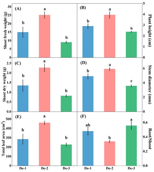 In anoxic conditions, waterlogging stress was negative for plant height, chlorophyll content, biomass, as well as leaf area and number, while total carotenoid content was increased in cucumber plants [46]. In this study, carotenoid content in De-3 was significantly higher than in De-1 and De-2, while the chlorophyll contents were prominently reduced. The reduction in chlorophyll content might decrease the photosynthesis rate and further inhibit kale growth. However, carotenoid pigments inhibited oxidative damage by binding singlet oxygen to protect the photosynthetic structures [46], and an increment in carotenoid content might enhance the ability to cope with an anaerobic environment. Therefore, the low depth of nutrient solution (De-1 and De-2) was more conducive to kale growth, root respiration, and the accumulation of chlorophyll in leaves, which promoted shoot growth, while the high depth of nutrient solution (De-3) inhibited shoot growth due to root hypoxia.