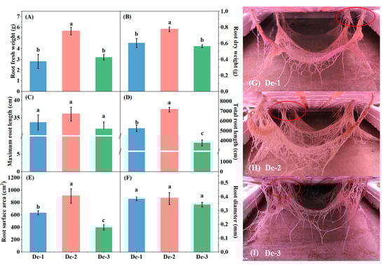 Figure 4. Root morphological properties of kale under different nutrient-solution depths as measured by (A) root fresh weight; (B) root dry weight; (C) maximum root length; (D) total root length; (E) root surface area; and (F) root diameter. Root morphology of kale 24 days after treatments: (G) De-1 treatment, (H) De-2 treatment, and (I) De-3 treatment. The red circles represent sprouting lateral roots in the air space. Different letters (a–c) marked upon the columns in the figure indicate significant differences between treatments by Duncan’s multiple (p < 0.05), and vertical bars represent the standard margin of error.