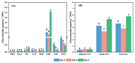 The highest content of total indole GLs in De-3 treatment was mainly due to the enhancement of GBC accumulation, whereas there was no significant difference in 4OH content across all treatments. The 4ME and NEO contents significantly increased by 323% and 109%, respectively, compared to De-3, while the contents of GBC significantly fell by 45% under De-1. Similarly, contents of 4ME and NEO were 74% and 38% higher, respectively, but GBC was 49% lower under De-2.