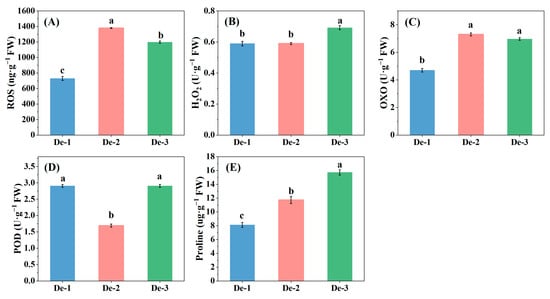To acquire a better understanding of the stress changes caused by nutrient-solution depth in the root, the levels of ROS, H2O2, and proline and the activity of POD and OXO were measured (Figure 7). Compared with De-3, the ROS content in kale roots significantly increased by 15% under De-2, while it was reduced by 40% in De-1 (Figure 7A). H2O2 contents in kale roots showed a significant reduction under De-1 and De-2 compared with De-3 (Figure 7B). OXO activity was dramatically reduced by 33% under De-1 compared to De-3, while De-2 showed no significant changes. (Figure 7C), and POD activity was reduced by 42% under De-2, while no obvious difference was found between De-1 and De-3 (Figure 7D). The proline content gradually increased with increased nutrient-solution depth, and there were remarkable 44% and 94% increments in De-2 and De-3 than De-1, respectively (Figure 7E).