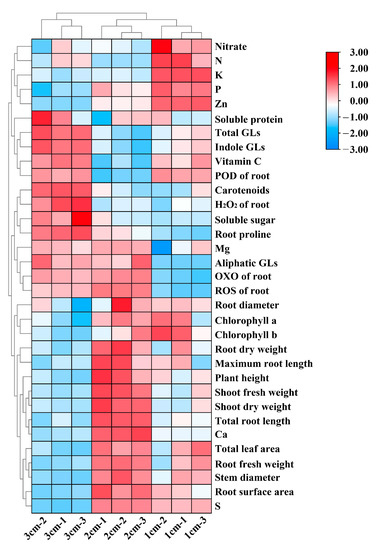 The impact of various nutrient-solution depths on the growth and quality of kale was visualized using a heat map (Figure 8). The cluster responded to various nutrient solution treatments with variable growth and quality responses. The De-1 and De-2 clusters both showed higher growth-related parameters and levels of chlorophyll a, chlorophyll b, Ca, and S, especially under De-2. Cluster De-3, nevertheless, was far away from the other two clusters. The De-3 cluster enhanced the contents of indole GLs, aliphatic GLs, total GLs, Mg, vitamin C, carotenoids, soluble sugar, proline, ROS, and H2O2 as well as the activities of OXO and POD in kale root. The De-1 cluster increased the content of nitrate, N, P, K, and Zn. These results indicated that lower nutrient-solution depth contributed to enhancing mineral element uptake and the growth of kale, while higher nutrient-solution depth enhanced the quality and stress response of kale.